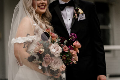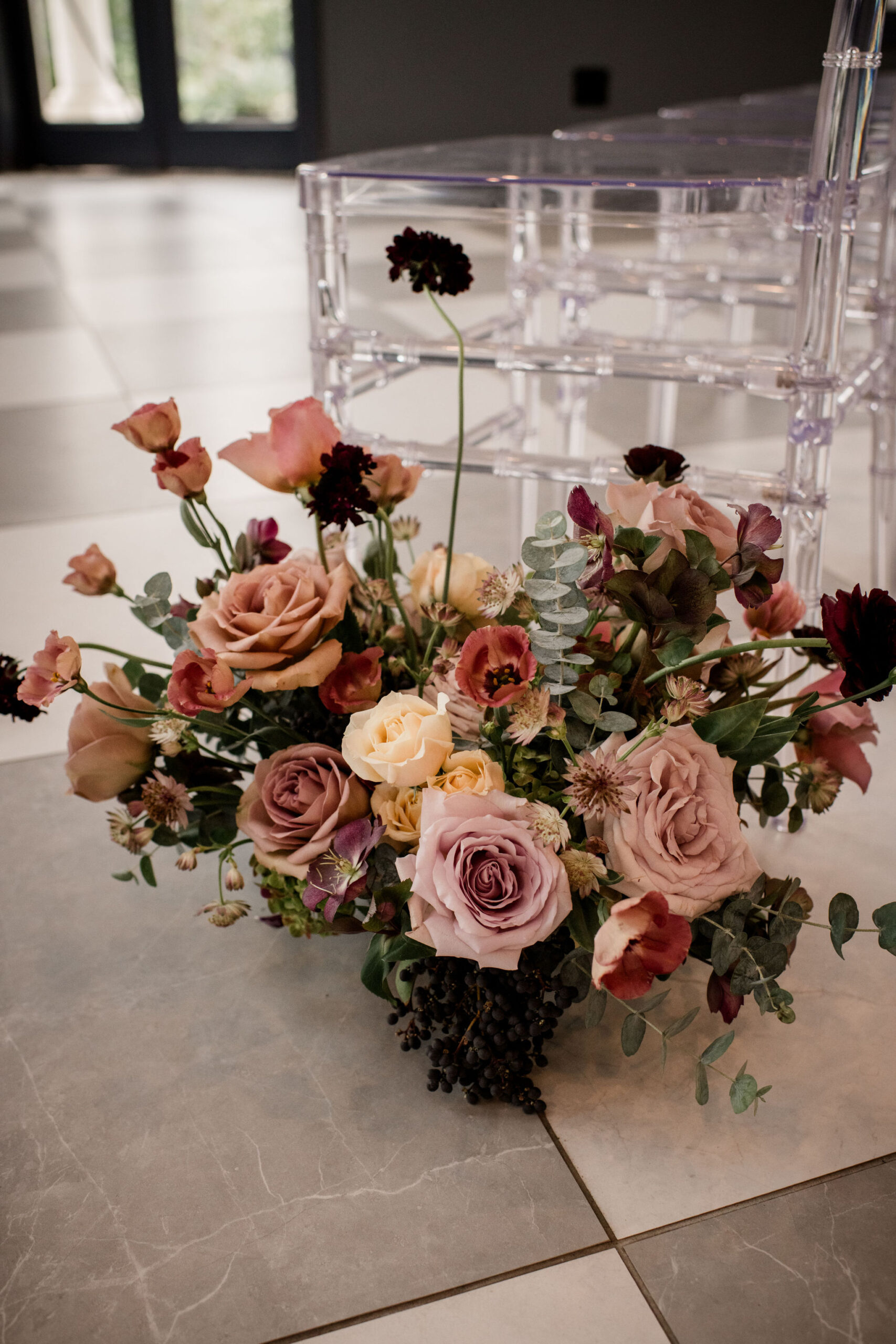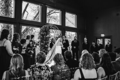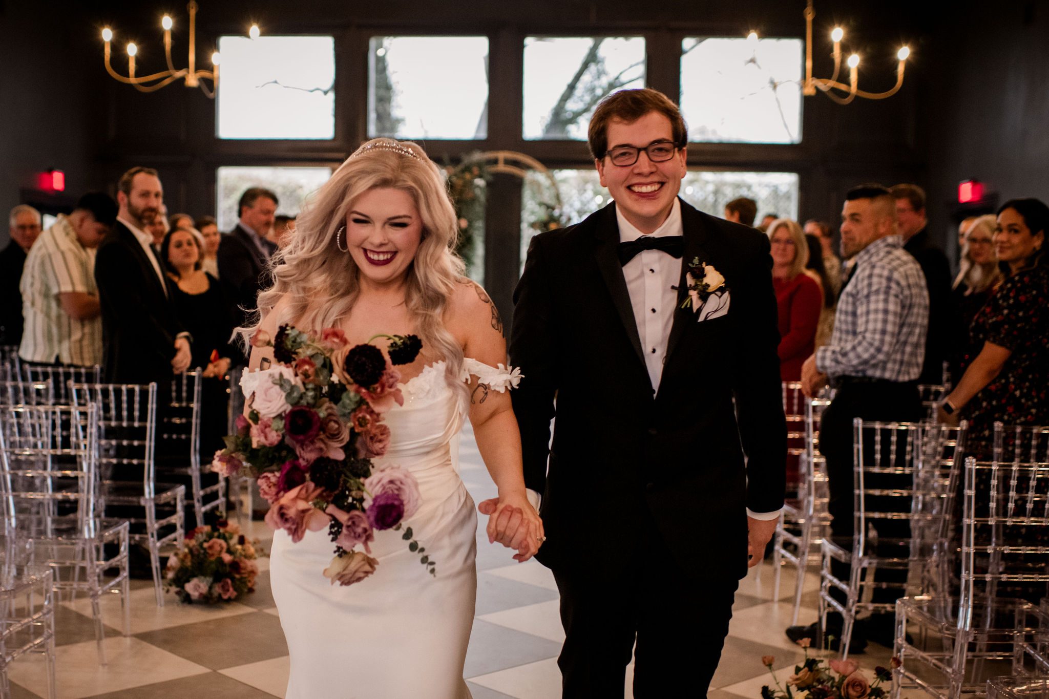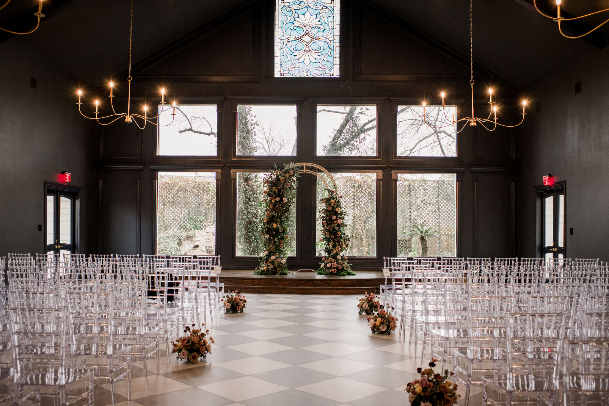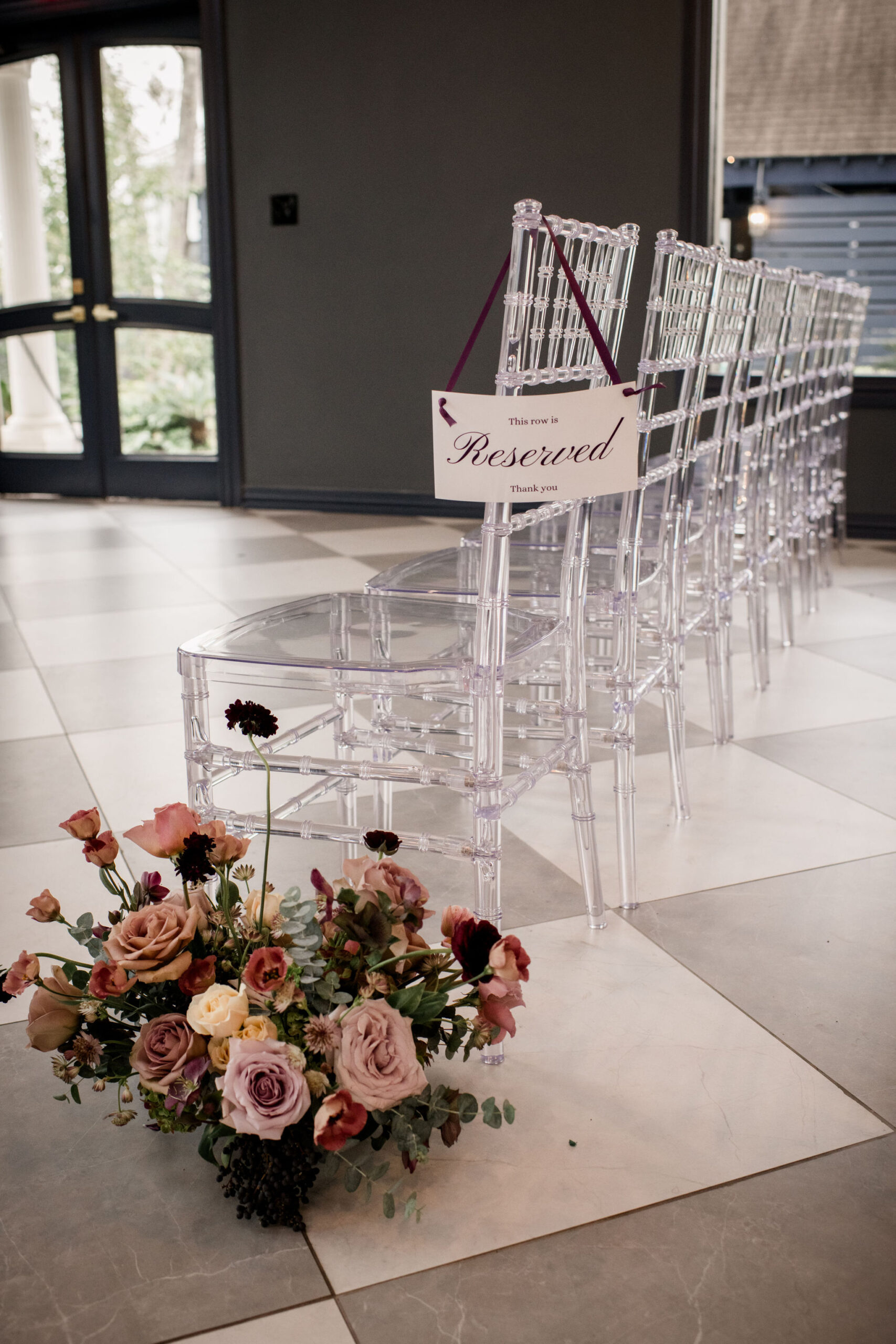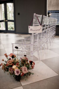 The ceremony space at The Vale was warm and inviting. Cali and Bloom adorned the altar and aisle with lush florals in soft, romantic tones. The mix of fresh blooms added depth and texture to the ceremony backdrop.